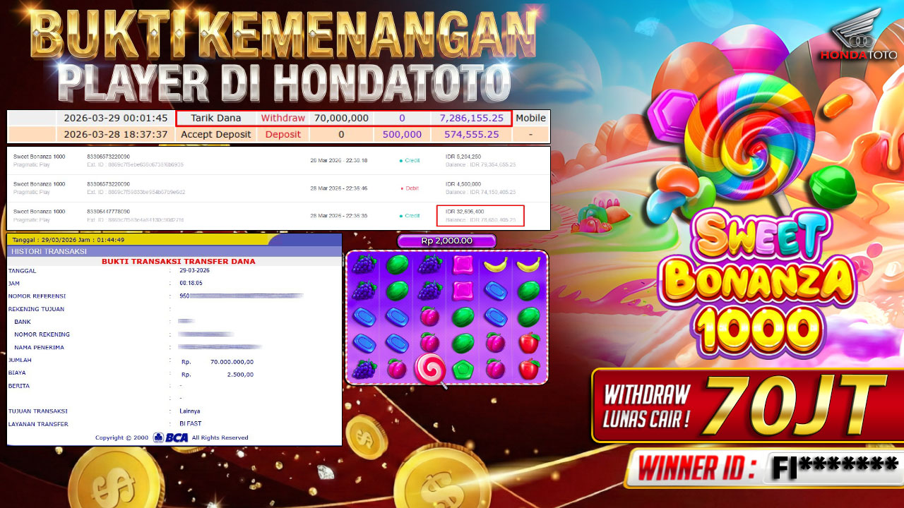 Bandar togel HONDATOTO merupakan bandar togel dan slot online yang membayar semua kemenangan member hingga lunas. Setiap pembayaran pada situs kami dilakukan dengan cara transfer ke rekening tujuan yang sudah di daftarkan pada situs togel online kami, Pembayaran hanya dapat di proses jika rekening yang di daftarkan telah valid dan dapat di transfer. Semua kemenangan member yang mendapatkan hadiah jackpot terbesar akan kami posting agar semua pemain dapat melihat bandar situs terpercaya HONDATOTO ini membayar semua kemenangan member hingga lunas. Setiap postingan yang kami posting akan kami lakukan sensor pada nomor rekening 4 digit dan nama rekening untuk menjaga privasi dan kerahasiaan member. Postingan Jackpot yang kami posting agar member atau pemain yang belum pernah bermain bisa melihat bandar togel Bukan Kaleng Kaleng Seperti HONDATOTO ini, Semua postingan jackpot yang kami posting dapat di lihat data keasliannya melalui nomor reff yang di tunjukan pada bank atau mbanking saat kita melakukan transfer.